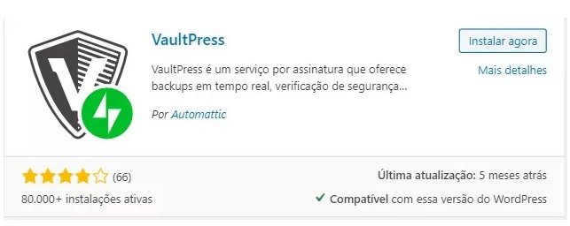 O Vaultpress é outro plugin bem popular, mas diferente do Updraftplus, que é um plugin gratuito, neste você precisa pagar para obter todas as funcionalidades oferecidas pelo VaultPress. Neste plugin, o backup para WordPress ocorre de forma automatizada em tempo real ou ainda em períodos agendados. A forma como será feito o backup pode ser definida por você no painel de configuração do WordPress. Além do backup automatizado, o sistema oferece recursos para restaurar o backup através de uma simples conexão FTP ou SSH e ainda soluções de segurança para prevenir ataques.
